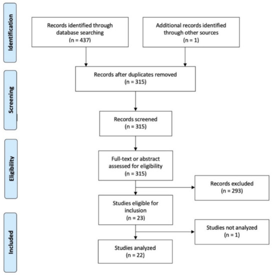 There were 437 studies identified by our search strategy in May 2021. All of them were evaluated for inclusion by title and abstract screening. Of 314 potentially relevant reports identified after eliminating duplicates, supplemented with one paper of the authors accepted for publication, 23 of them met the inclusion criteria. Five of the 23 included studies were CCS [18,22,23,24,25], and the remaining 18 were CS or cross-sectional studies [26,27,28,29,30,31,32,33,34,35,36,37,38,39,40,41,42,43] as reported by the authors of the papers or deduced from the authors of this review.