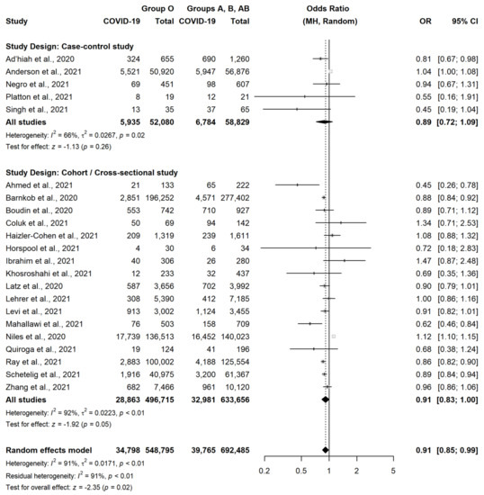 According to our meta-analysis, group O was slightly less associated with the occurrence of SARS-CoV-2 infection, as compared to the other three blood groups (OR = 0.91, 95% CI = 0.85–0.99, p = 0.02) (Figure 2).