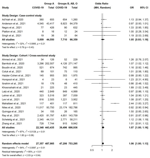 This association was similar in CCS (OR = 0.89, 95% CI = 0.72–1.09, p = 0.26) and in CS or cross-sectional studies (OR = 0.91, 95% CI = 0.83–1.00, p = 0.05), although statistical significance was not observed in both these subgroups. Conversely, group A was slightly more associated with the occurrence of SARS-CoV-2 infection, as compared to the other three blood groups (OR = 1.06, 95% CI = 1.00–1.13, p = 0.04) (Figure 3).