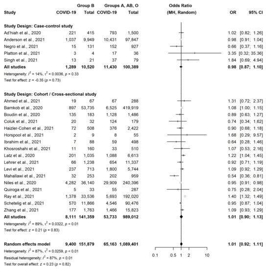 A significantly lower susceptibility of infection was associated with the O blood group compared to the non-O blood group and a higher risk in A blood type compared with non-A participants also obtained by Gutierrez-Valencia M. et al. with OR, respectively, of 0.88 (0.82–0.94) and 1.08 (1.02–1.15) in a recently published review in which 29 studies updated in May 2021 were included in the analysis of COVID-19 infection prediction [56]. The odds values are very similar to those of our meta-analysis. A comparison of each of the four ABO blood types with the remaining three ones, and an additional analysis considering all six pairwise comparisons between ABO blood groups were performed by both research groups.