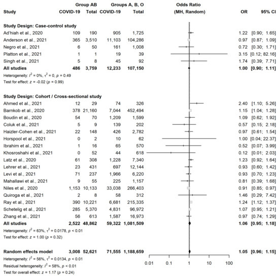 We found that a potential relationship between the ABO blood group and susceptibility to SARS-CoV-2 infection may exist. Blood type A was statistically more associated with SARS-CoV-2 infection (OR = 1.06), whereas blood group O was less associated with infection (OR = 0.91). In CS or cross-sectional studies, which were the most part of included studies, the results were similar (OR = 1.07 and OR = 0.91, respectively). This, together with the analysis of absolute risks in the single CS and cross-sectional studies, highlights that the differences amongst groups were slight. Several studies have evaluated the correlation between the ABO blood group and the risk of different infections [44,45,46].