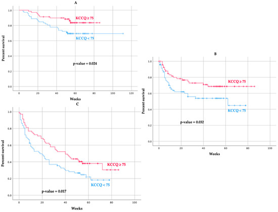 The KCCQ-12 is the short version (12-item) of the Kansas City Cardiomyopathy Questionnaire (KCCQ) (23-item). This self-administered test measures symptoms, physical and social limitations, and quality of life in patients with HF. It has been validated in HF both with reduced and preserved ejection fractions [8,26]. Moreover, it has proven to be both reproducible and sensitive to important changes in HF health status [26,27,28,29]. The shorter version has shown to be more feasible to implement while preserving the psychometric properties of the full instrument [22]. Scores for each domain are summarized by the KCCQ summary score, which has values between 0 and 100, with higher scores indicating better HF-specific health status. An increase of fewer than 5 points is considered a small clinical change [28]. Several studies have established a KCCQ-12 cut-off point of 75 or higher to identify patients with good-to-excellent HRQoL [30]. Therefore, we considered HRQoL impaired if KCCQ-12 was below 75. In the SENECOR study, KCCQ-12 was measured during the baseline visit. At one-year follow-up, all the baseline assessments including KCCQ-12 were repeated in those who survived.
