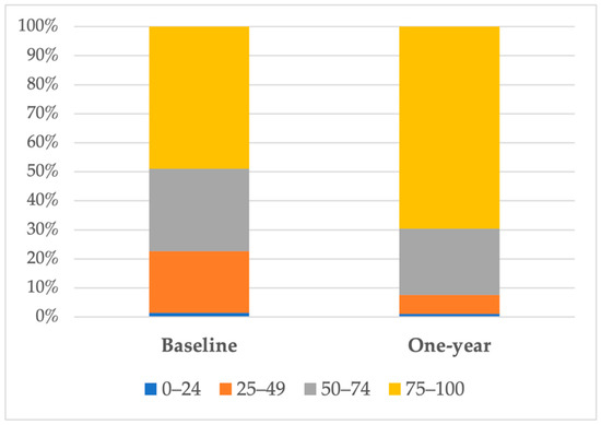 In patients with a KCCQ-12 measured at one year, there was a statistically significant increase in KCCQ-12. KCCQ-12 went from 71.5 ± 21.5 to 83.1 ± 20.8, p < 0.001, and 69.6% of patients had good-to-excellent HRQoL (Figure 3).
