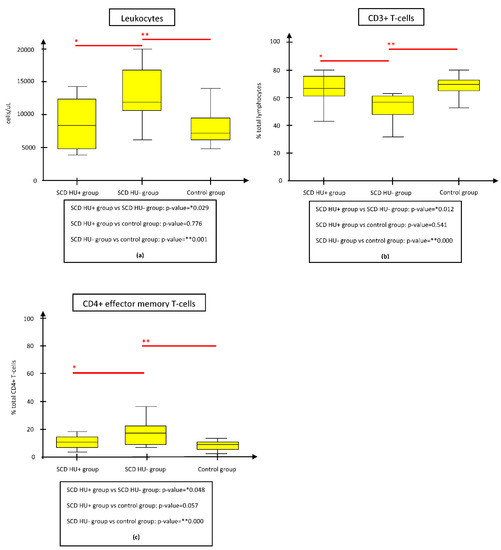 - Koffi, K.G.; Sawadogo, D.; Meite, M.; Nanho, D.C.; Tanoh, E.S.; Attia, A.K.; Sanogo, I.; Sangare, A. Reduced levels of T-cell subsets CD4+ and CD8+ in homozygous sickle cell anaemia patients with splenic defects. Hematol. J. 2003, 4, 363–365. [Google Scholar] [CrossRef]