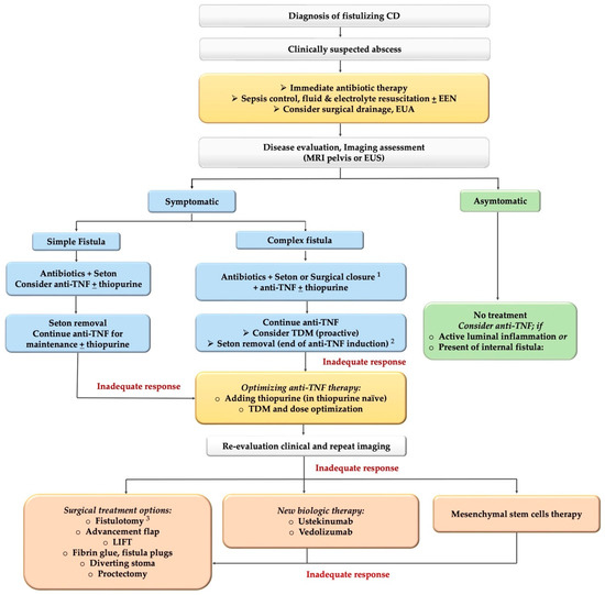 In summary, the addition of antibiotics to anti-TNF is more effective than anti-TNF alone in inducing a short-term fistula response but not in maintaining remission in the long term. Current practice guidelines recommend the initial use of antibiotics combined with anti-TNF in the treatment of active fistulizing CD [14,16,17,19]. Of note, for patients with perianal abscesses or complex fistulas, parallel seton or surgical drainage should be considered to control sepsis and fistula complications [19].