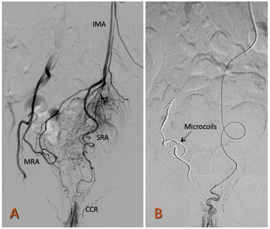 - Venturini, M.; De Nardi, P.; Marra, P.; Panzeri, M.; Brembilla, G.; Morelli, F.; Melchiorre, F.; De Cobelli, F.; Del Maschio, A. Embolization of superior rectal arteries for transfusion dependent haemorrhoidal bleeding in severely cardiopathic patients: A new field of application of the "emborrhoid" technique. Tech. Coloproctol. 2018, 22, 453–455. [Google Scholar] [CrossRef]