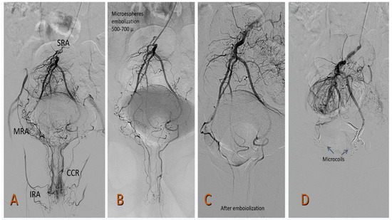 - Stecca, T.; Farneti, F.; Balestriero, G.; Barban, M.; Caratozzolo, E.; Zilio, S.; Massani, M. Superior Rectal Artery Embolization for Symptomatic Grades 2 and 3 Hemorrhoidal Disease: 6-Month Follow-up among 43 Patients. J. Vasc. Interv. Radiol. 2021, 32, 1348–1357. [Google Scholar] [CrossRef]