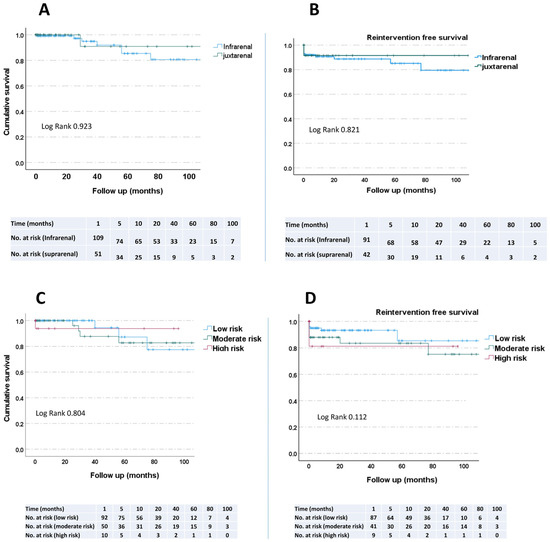 Kaplan–Meier survival and reintervention estimates showed no significant difference between the groups. (A,B) Patients stratified into two groups: infrarenal aneurysm (n = 137) and juxtrarenal aneurysm (n = 77). (C,D) Patients were stratified into three groups according to the surgical risk (Medicare Aneurysm Scoring System): low risk (n = 137), moderate risk (n = 61), and high risk (n = 19).