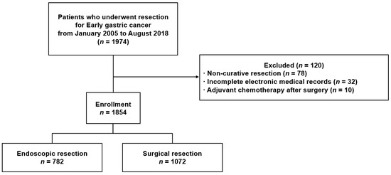 We retrospectively reviewed the electronic medical records of 1974 patients who underwent endoscopic or surgical resection for EGC at Gangnam Severance Hospital in Seoul, Korea between January 2005 and August 2018 (Figure 1). Only Korean patients over 18 years of age were included, and the exclusion criteria were as follows: (1) non-curative resection (n = 78), (2) incomplete electronic medical records (n = 32), and (3) adjuvant chemotherapy after surgical treatment (n = 10). As a result, 1854 patients were enrolled in this study. With regard to the method of resection, 782 patients (42.2%) underwent endoscopic resection (720 for endoscopic submucosal dissection and 62 for endoscopic mucosal resection) and 1072 patients (57.8%) underwent surgical resection (129 for total gastrectomy and 943 for subtotal gastrectomy).