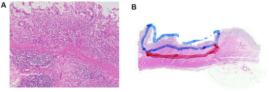 To analyze the expression of candidate genes, namely, SFRP4 and CDX1, formalin-fixed, paraffin-embedded (FFPE) tumor tissues designated for use as endoscopic and surgical specimens were sliced into 4-µm-thick tissue sections. The representative cancer regions of the mucosa and/or submucosa were identified and marked on the hematoxylin and eosin (H&E) stained slides by a pathologist. A previous study by Minata et al. reported that the gene expressions of the tumor core and invading edge are different [21]. Therefore, in cases of submucosal cancer, we marked the cancerous regions of the mucosa and submucosa with different colors and performed gene analysis in these 2 regions separately (Figure 2).