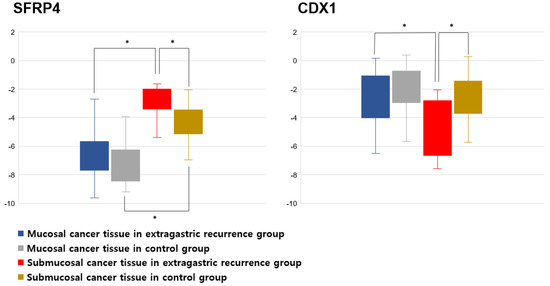 Figure 3 shows the expression of SFRP4 and CDX1 in 16 extragastric recurrences and 32 control cases, respectively. The mean SFRP4 expression of submucosal cancer tissue in the extragastric recurrence group (−2.8 ± 1.3) was significantly higher than that in the control group (−4.3 ± 1.6) (p = 0.047). In both the extragastric recurrence group (−2.8 ± 1.3 vs. −6.6 ± 1.8, p < 0.001) and the control group (−4.3 ± 1.6 vs. −7.1 ± 1.5, p < 0.001), SFRP4 expression was significantly higher in the submucosal cancer tissue than that in the mucosal layer. The mean CDX1 expression in the submucosal cancer tissue of the extragastric recurrence group (−4.6 ± 2.0) was significantly lower than that in the control group (−2.4 ± 1.8) (p = 0.025). In the extragastric recurrence group, the expression of CDX1 in the submucosal cancer tissue was significantly lower than the expression observed in the mucosal layer (−2.4 ± 1.8 vs. −2.6 ± 2.0, p = 0.047). Among the 16 patients who experienced extragastric recurrence in our study, 10 received chemotherapy, one received radiotherapy for recurrence, and five were follow-up loss.