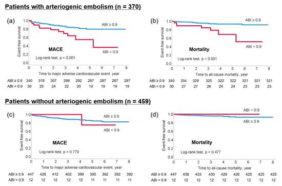 Patients were followed up for a median of 45.8 months (interquartile range, 30.2–68.4 months). Overall, 120 patients suffered MACE (14.5%), which included 71 stroke recurrences (8.6%), and 48 (5.8%) died during the study period. The Kaplan–Meier survival curve showed that an ABI < 0.9 was significantly associated both with an increased risk of MACE and all-cause mortality (log-rank test; all p < 0.05). Subgroup analysis showed that an ABI < 0.9 was significantly associated with an increased risk of MACE and all-cause mortality in patients with arteriogenic embolism (log-rank test, all p < 0.05; Figure 2a,b) but not in those without arteriogenic embolism (Figure 2c,d).