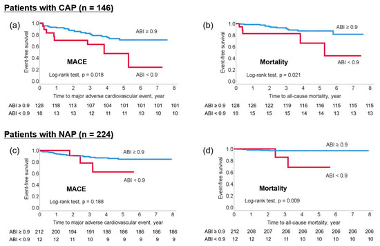 Three hundred and seventy (44.6%) arteriogenic embolism cases included 146 (17.6%) CAP and 224 (27.0%) NAP cases. The Kaplan–Meier survival curve showed that an ABI < 0.9 was significantly related to an increased risk of both MACE and all-cause mortality in patients with CAP (log-rank test; all p < 0.05). In patients with NAP, an ABI < 0.9 was not related to MACE but was associated with all-cause mortality (log-rank test; p < 0.05; Figure 3).