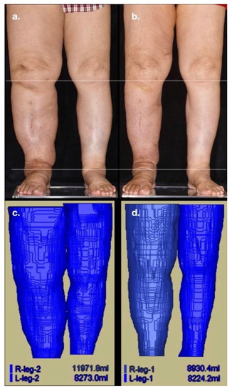 (a) An 81-year-old woman with a body mass index (BMI) of 27.4 kg/m2 received a total hysterectomy with lymph node dissection followed by adjuvant radiotherapy for cervical cancer 19 years ago. Right lower-limb lymphedema was noted for 14 years with recurrent cellulitis (three times). (b) One-year follow-up after lymphaticovenous anastomosis (LVA) showing notable volume reduction in the affected limb after the performance of a total of nine LVAs. (c) Pre-LVA magnetic resonance (MR) volumetry demonstrating a right lower-limb volume of 11,971.8 mL and a left lower-limb volume of 8273.0 mL, with the volume gained in the affected limb due to lymphedema being +3698.8 mL (11,971.8 mL minus 8273.0 mL). (d) Post-LVA MR volumetry at one-year follow-up revealing a reduced right lower-limb volume of 8930.4 mL (minus 3041.4 mL) with the percentage volume reduction being 82.2% (3041.4 mL/3698.8 mL times 100).