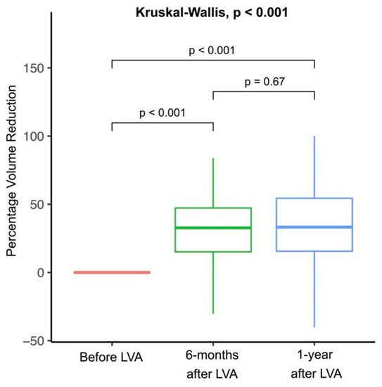 Percentage volume reduction in the lymphedematous limb following lymphaticovenous anastomosis (LVA) showing significant volume reduction at postoperative six months and one year when compared to the pre-LVA volume (both p < 0.001), but without significant difference between postsurgical six months and one year (p = 0.67).
