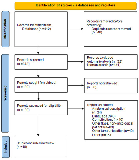 The type of each study, date of publication, aim, conclusion endpoints and level of evidence were data extracted and presented. Ten full-text articles comprising 92 patients with 93 supraclavicular flaps were included according to the eligibility criteria [11,12,13,14,15,16,17,18,19,20]. The procedure is presented in Figure 3 (PRISMA 2020 flow diagram) [8].