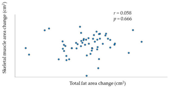 Patient characteristics are shown in Table 1. Among the 58 patients included, 23 had the advanced-stage disease (FIGO stages III and IV). All histological types were included, and serous was the most dominant histological subtype (39.7%). The mean BMI at diagnosis was 22.73 ± 3.82 kg/m2. The changes in median muscle mass and fat mass after debulking surgery and chemotherapy are shown in Table 2. Treatment with primary debulking surgery and chemotherapy significantly decreased median skeletal muscle mass. The median decrease in skeletal muscle during this period was 2.55% per 100 d. Conversely, the decrease in fat mass, including total, cutaneous and visceral fat mass, was not significant. The prevalence of loss or gain in muscle or fat volume is summarized in Table 3. Table 4 shows the prevalence of patients with loss/gain of muscle/fat volume in each FIGO stage. There was no association between changes in skeletal muscle mass and total fat mass (Figure 1; r = 0.058, p = 0.666).