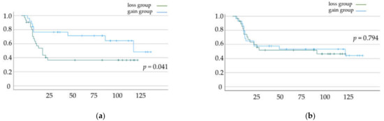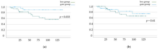 DFS and OS rates based on the status of skeletal muscle mass change and total fat mass change are shown in Figure 2a,b and Figure 3a,b, respectively. Significant differences in DFS and OS were observed when patients were classified based on the status of skeletal muscle mass change (p = 0.033 (Figure 2a) and p = 0.041 (Figure 2b), respectively). In contrast, we did not find a significant difference in OS and DFS when patients were classified based on the status of total fat mass change (p = 0.61 (Figure 3a) and p = 0.794 (Figure 3b), respectively).