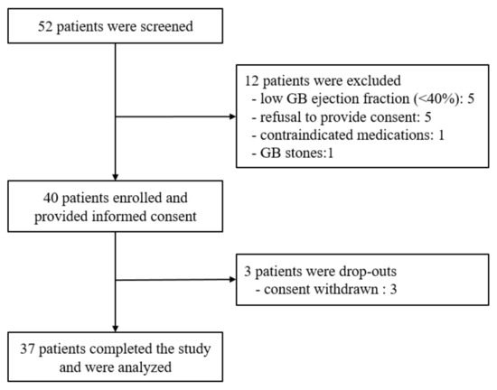 A total of 52 patients were prospectively screened at six institutions (Figure 1). Twelve were excluded because of low gallbladder contractility (n = 5), refusal to provide consent (n = 5), concomitant use of prohibited drugs (n = 1), and the presence of cholelithiasis (n = 1). The final analysis was performed with 37 patients after excluding 3 patients who subsequently withdrew consent.