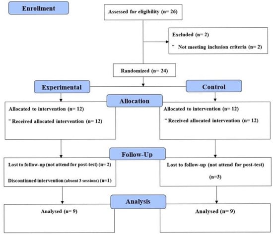 This study followed a randomised control trial with a pre-test–post-test control group (parallel design). The experiment was performed in the swimming pool of the Public Authority for Sports in Dammam. The calculation of the sample size was based on a previous randomised control trial by S. Girold et al. [], who examined the effect of speed training exercises on a 50 m swim time (ST) by calculating the mean and standard deviation (SD) of the two groups, with 80% power and 0.05 type 1 error. Group 1 (experimental n = 11) had a mean of 29.69 and SD of (2.45), and Group 2 (control n = 11) had a mean of 32.85 and SD of (2.77). The ratio between the two groups was 1:1, with a 0.05 significance level (alpha) and 80% power. The results showed that 18 subjects were required, with nine subjects in each group.