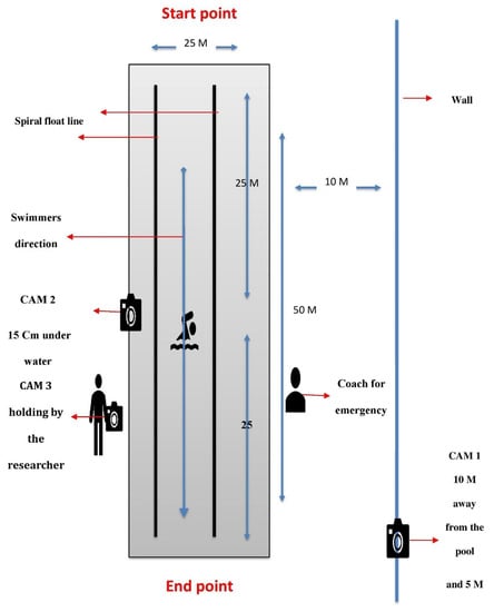 All swimming performance measurements were taken in the same indoor swimming pool (50 m) at a temperature of 30 °C. Safety procedures were followed to ensure minimal risk, and this included a rescue team being available in the swimming pool. Furthermore, safety equipment, such as safety ropes and safety rings, was available in the swimming pool to prevent the risk of drowning. Special preparations were followed to determine the stroke parameters, including setting up a straight-line sector in the swimming pool []. Divider markers in the form of spiral float line lane ropes of 50 m were placed in the swimming pool. Three high-speed waterproof video cameras (GoPro HERO7, GoPro Inc, San Mateo, CA, USA) were used. One camera was placed on a wall 10 m away from the swimming pool to detect the total ST from the start point to the end point. The second camera was placed 0.15 m underwater in the centre of the lane to detect the stroke parameters []. The third camera was movable by the researcher to keep track of the entire trial (Figure 2). A chronometer was used by the coach to detect the ST to avoid possible time error. This measure is widely used to identify the stroke parameters [,]. To calculate the stroke parameters, the swimmers were asked to perform 15 min of warm-up exercises before the trial. Each swimmer was asked to take up a starting position in the swimming pool, followed by a 50 m front crawl swim with a maximum performance from a push-off start from the wall at the surface level (to isolate the effect of a dive) to the 50 m end point. The swimmers were asked to swim in a straight line at the whistle signal. Data were saved on the investigator’s laptop with password protection, which means that only the researchers had access to the information. The trial measurement time took a total of 1.5 h. After taking the measurements, we used Pinnacle 22 software (https://www.pinnaclesys.com, accessed on 23 January 2021) to analyse the stroke parameters by viewing the trials and calculating the strokes. This program is valid and reliable [].