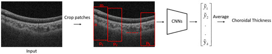 The flowchart of the proposed algorithm for the estimation of choroidal thickness is shown in Figure 1. A B-scan image was first cropped into several patches. A trained CNN model was then used to estimate the choroidal thickness for each patch. The mean thickness of the choroid in the B-scan was obtained by taking the average of the choroidal thickness on each patch.