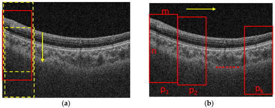 The process for cropping the images is shown in Figure 2. Assume that the size of a B-scan image is N × M, where N is the height and M is the width of the B-scan image, respectively. The B-scan image is first divided into K segments in horizontal direction equally. The width of a patch is m = M/K. The height of a patch is n (n < N), which is set based on the rule that the patch should contain the foreground while excluding the background as much as possible. To determine the location of a patch in the vertical direction, we slide the window with a size of n × m from top to end in a B-scan image with a fixed stride, e.g., 10 pixels, as shown in Figure 2a, and the one with maximal summed intensity is selected as the final patch. Then, we slide the window into the next patch with the stride of m in the horizontal direction, as shown in Figure 2b, and repeat the process shown in Figure 2a. The process shown in Figure 2b is also repeated until the window reaches the rightmost side of the B-scan. It is worth noting that there is no intersection between two adjacent patches, so it is convenient for us to take the average choroidal thickness on each patch to compute the mean thickness of the choroid in the whole B-scan.