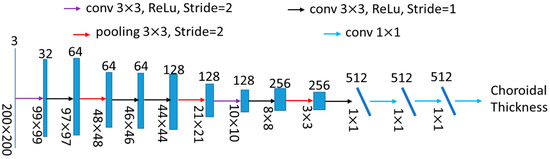 However, to the best of our knowledge, there is little published research on the estimation of choroidal thickness in OCT images without segmentation. In this study, the characteristics of the choroid, e.g., its shape, are different from the objectives reported in existing studies [21,22,23,24,25,26,27]. In addition, the imaging technologies used to obtain the data needed for different objectives are also different. Thus, a question arises as to whether direct methods are also effective for estimating the choroidal thickness based on OCT images. To explore this issue, in this paper, we propose a method to estimate the choroidal thickness in OCT images directly based on CNNs, making this the first study to estimate the choroidal thickness in OCT images without segmentation.