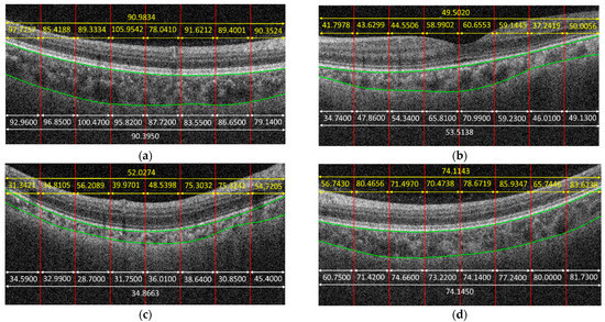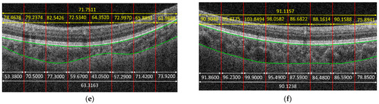From Table 1, we can also observe that the ME value was negative for patches with sizes of 200 × 50, 200 × 100, and 200 × 200, which indicates that the CNNs tended to underestimate the values of choroidal thickness for these cases. While for patches with a size of 400 × 400, the ME value was positive, which means that the CNNs tended to overestimate the values. Another phenomenon observed in Table 1 is that the performance at the B-scan level was always better than the performance at the patch level regardless of the patch size. The reason is that the mean thickness of choroid in a B-scan is computed by taking the average of the thicknesses on the patches cropped from that B-scan, which makes the errors in patch level offset each other to some extent. Figure 4d gives an example; as can be observed, the trained CNN model could not predict the choroidal thickness correctly for some patches—namely, the predicted results were larger or smaller, compared with the ground truth. However, when we took the average, the biases in larger and smaller cases offset each other; thus, the precision of choroidal thickness at the B-scan level improved, compared with that at the patch level.