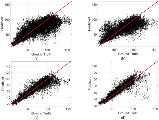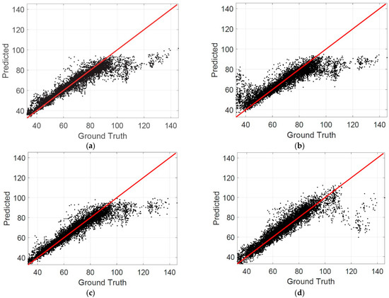 The scatterplots in B-scan level: (a) rhe patch size is 200 × 50; (b) 200 × 100; (c) 200 × 200; (d) 400 × 400.