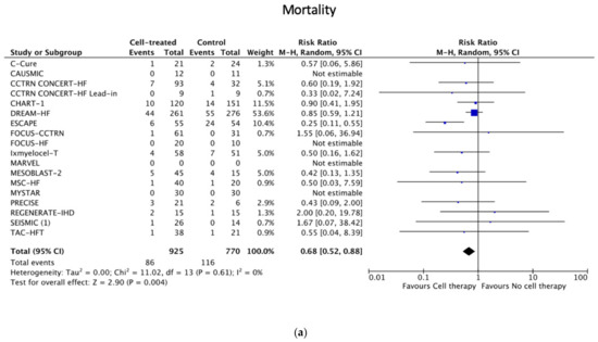 Pooled data of the 3 treatment groups of the dose-escalation MESOBLAST-2 study were recalculated and added to the statistical analysis [20]. Due to the cross-over of patients who were randomized to cell therapy but did not fulfil the inclusion criteria of bone marrow quality in C-CURE and CHART-1 studies, different outcome parameters (e.g., all-cause mortality) were interpreted in intention-to-treat and real treatment groups, resulting in some discrepancies in text and tabulated data of the original publications. As a compromise, the data presented in summary tables of the publications were included in the present analysis [17,18]. The CHART-1 study primary efficacy endpoint was a combined outcome calculated from 6 different parameters [18]. Therefore, the serious adverse events reported by blinded investigators were considered major adverse events (secondary safety endpoint). The CCTRN-CONCERT-HF Lead-in and the following multicenter CCTRN-CONCERT-HF studies were summarized in one paper. To enable us to enter both the primary and secondary endpoints, we separated the 2 studies. The pooled data of the 3 treatment groups of CCTRN-CONCERT-HF were recalculated for one treatment group [24]. The first clinical safety results of the DREAM-HF study were recently reported at the Scientific Session of the American Heart Association 2021 [25].