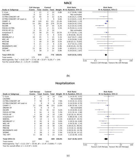 Cell therapy showed a significant (p < 0.001) reduction in all-cause mortality (primary endpoint) (Figure 2a), MACEs (Figure 2b), hospitalization (Figure 2c) (secondary endpoints) and the incidence of heart transplantation with/without previous implantation of a left ventricular assist device (LVAD), favoring cell therapy during the predefined follow-up in all (n = 1715) patients from 18 studies (Table 3). The ESCAPE, CHART-1, DREAM-HF and IXMYELOCEL-T trials presented a relatively high mortality rate, with a consequently high incidence of MACEs and hospitalization. It is noteworthy that the definitions of a serious adverse event were different among the studies. The stepwise exclusion of these studies (sensitivity analysis) did not influence the results.