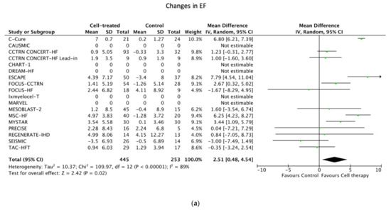 Cell therapy led to a significant increase in LVEF, with a mean of 2.51% (95% CI of 0.48; 4.54) both in the combined (n = 18 studies) (Figure 3a) and in the ACCRUE-IPD (mean change of 3.1% with a 95% CI of 0.85; 5.34) (n = 8 studies) (Supplementary Figure S3a) meta-analysis.