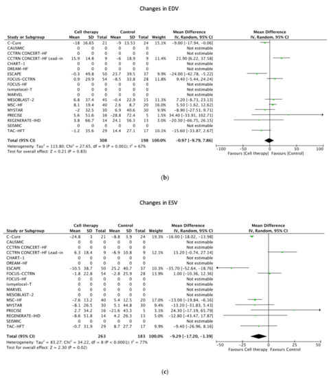 No meaningful changes in EDV were observed between the groups, neither in the combined nor in the ACCRUE-IPD analyses (Figure 3b and Figure S3b). However, cell therapy led to a significant decrease in ESV in the cell-therapy group (Figure 3b and Supplementary Figure S3b).