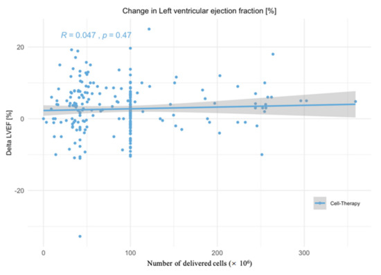 No correlation between number of injected cells and changes in left ventricular ejection fraction (LVEF) at follow-up only IPD of the ACCRUE studies included.