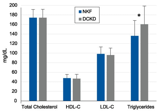 Plasma concentrations of lipid levels in subjects with T2DM and normal kidney function (NKF) or diabetic chronic kidney disease (DCKD). * p < 0.01.