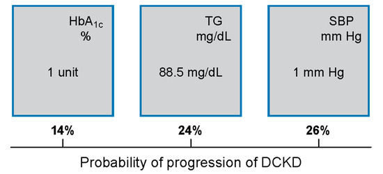 An increase of HbA1c by 1 unit, triglycerides (TG) by 88.5 mg/dL, and systolic blood pressure (SBP) by 1 mm Hg, increased the progression of diabetic chronic kidney disease (DCKD) by 14%, 24%, and 26%, respectively.