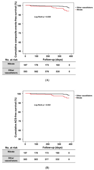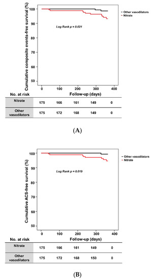 Chicago/Turabian StyleKim, Hyun-Jin, Sang-Ho Jo, Min-Ho Lee, Won-Woo Seo, Hack-Lyoung Kim, Kwan Yong Lee, Tae-Hyun Yang, Sung-Ho Her, Byoung-Kwon Lee, Keun-Ho Park, and et al. 2022. "Nitrates vs. Other Types of Vasodilators and Clinical Outcomes in Patients with Vasospastic Angina: A Propensity Score-Matched Analysis" Journal of Clinical Medicine 11, no. 12: 3250. https://doi.org/10.3390/jcm11123250