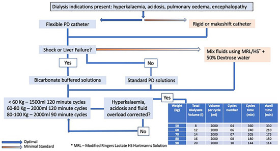The latest ISPD guidelines for acute PD have detailed procedures and prescriptions that can be implemented in both resource-rich and resource-poor settings. The ideal recommended access is a flexible Tenkhoff catheter. Rigid catheters and drainage tubes are alternatives in resource-scarce areas. A closed system of fluid delivery and drainage is advised. The prescription can be either automated PD, which reduces nursing time but requires functional electricity, or manual PD, which is recommended in resource-poor settings. Standard dialysate is recommended when available; however, locally made solutions are an alternative where there are inadequate supplies. Though some studies have shown good outcomes with a targeted Kt/V of 3.5 (comparable to those of HD), other studies have shown similar outcomes with lower dialysis doses. Additionally, the volume of fluid required to achieve the higher clearances would be prohibitively expensive in certain countries. The acute PD prescription targets a weekly Kt/V of 2.1; its workflow is shown in Figure 1 [13].