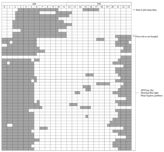 - The lower part is about a 5-week period during treatment with APZ 3 mg/day, blue light, and sleep hygiene guidance. From the next morning after starting the treatment, the patient got up around 6:00 to 7:00 a.m. and went to bed around 9:00 to 10:00 p.m., and his sleep rhythm became faster than before the treatment.