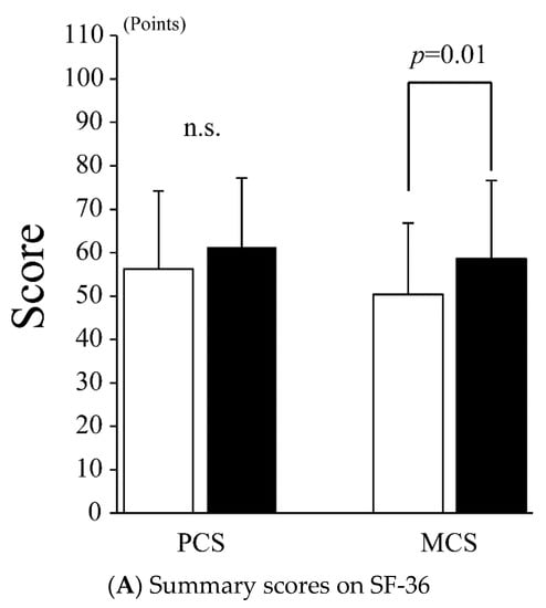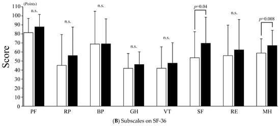 Quality of life by SF-36. (A) SF-36: 36-item short-form health survey; PCS: physical component summary; MCS: mental component summary. The white and black bars indicate the values before and after treatment, respectively. Values are presented as the mean ± SD. Error bar represents SD. (B) SF-36: 36-item short-form health survey; PF: physical functioning; RP: role-physical; BP: bodily pain; GH: general health; VT: vitality; SF: social functioning; RE: role-emotional; MH: mental health. White and black bars indicate values before and after treatment, respectively. Values are presented as the mean ± SD. Error bar represents SD. n.s., not significant.