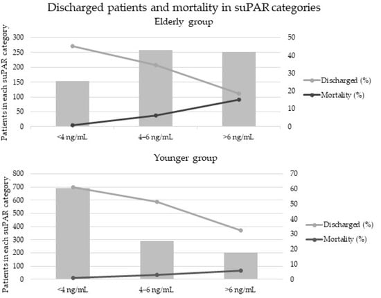 The age groups were divided into three additional groups according to their suPAR levels: (1) suPAR <4 ng/mL, (2) suPAR 4–6 ng/mL, (3) suPAR >6 ng/mL. As Figure 1 shows, increasing suPAR levels were associated with decreasing proportion of discharged patients, the percentage of discharged patients within each suPAR category being: (1) 61% (2) 51% (3) 32% in the younger and (1) 45% (2) 34% (3) 19% in the elderly. Additionally, mortality rate increased along the suPAR level category: (1) 0.9% (2) 3% (3) 6% in the younger and (1) 0.7% (2) 6% (3) 15% in the elderly.