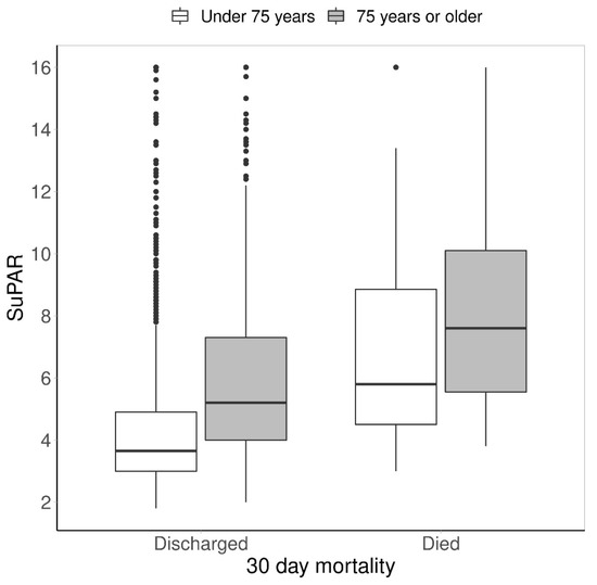 SuPAR levels were additionally observed between the discharged patients and the patients who died within 30 days of index admission. The differences were investigated in the two age groups. The median suPAR levels of the younger group who died within 30 days [5.8 ng/mL (IQR 4.1–9.7) were significantly higher than the levels of the younger discharged group [3.5 ng/mL (IQR 2.9–4.4)]. A similar trend was seen in the elderly group [7.6 ng/mL (IQR 5.5–10.1) vs. 4.5 ng/mL (IQR 3.7–5.8)]. Median suPAR values were higher in the elderly group, both in the discharged group and mortality group (See Figure 2).