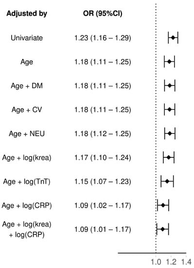 The results for regression models can be found from Figure 3. SuPAR had an odds ratio (OR) of 1.23 (95% CI: 1.16–1.29) as a 30-day mortality predictor. When adjusting suPAR by age its OR slightly dropped: 1.18 (95%CI: 1.11–1.25). As age was correlated with suPAR, we kept it as a predictor and further adjusted the model with neurological and cardiovascular comorbidities, diabetes mellitus and logarithmized plasma levels of creatinine (krea) and troponine T (TnT). All of these had an association of equivalent level as when only adjusting suPAR with age. Only C-reactive protein (CRP) lowered the OR of suPAR considerably, when also adjusting with age the OR dropped to 1.09 (95%CI: 1.02–1.17). However, adding creatinine to the model with both age and CRP did not lower the OR of suPAR further (OR 1.09 95% CI: 1.01–1.17). Adding an interaction between the age and suPAR did not significantly increase fit of the model (LRT age as group p = 0.72, age as continous p = 0.63).