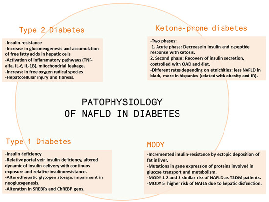 This review describes the relationship between DM and non-alcoholic fatty liver disease, the pathophysiological rationale behind this relationship, and its clinical relevance and outcomes. Figure 1 reflects the main mechanisms involved in the physiopathology of NAFLD in different types of diabetes.
