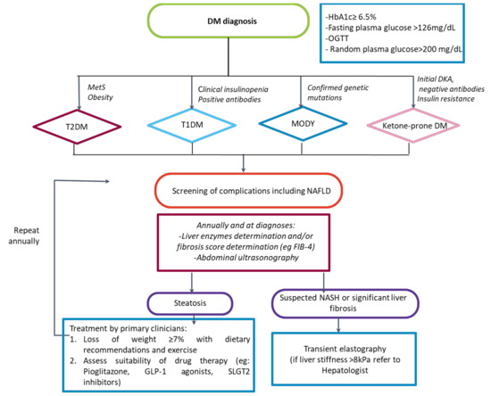 In recent years, in parallel to the increase of its prevalence worldwide, the knowledge of NAFLD diagnosis, pathophysiology, and treatment has grown exponentially. The relevance of NAFLD as a global public health threat is reinforced by its parallel evolution alongside DM, obesity, and MetS. This review aimed to underscore that different DM phenotypes have various types of liver involvement that need personalized management. Despite the lack of approved drugs by the FDA and EMA to treat NAFLD, several pharmacological treatments are used to treat DM, obesity, or dyslipidemia that are shown to be efficacious in treating NAFLD; yet, the evidence is still preliminary. Unfortunately, in the diabetes field, there is no consensus on how to screen for NAFLD. In the hepatology field, there are gaps in the recommendations for liver fibrosis screening in diabetic patients. The gold-standard method to evaluate the presence of NASH is the liver biopsy, as we could observe in some prospective studies that demonstrated a prevalence of 58.52% among patients with metabolic syndrome and 96.82% in T2DM patients [197]; other studies recorded lower prevalence such as that registered in a global systematic review performed in 2017 with a value of 54% [44]. Transient elastography is the screening test more implemented in the daily care routine, although it has a moderate sensitivity compared with the results of biopsy. In a meta-analysis published in 2013, this test reported a high diagnostic accuracy, with an Area under the curve (AUC) in the range of 0.84–0.87 for fibrosis stage ≥ F2, 0.89–0.91 for fibrosis stage ≥ F3, and 0.93–0.96 for fibrosis stage F4 [197], which was also recommended for NAFLD because of its cost-effectiveness and the lack of adverse events. We proposed a simple algorithm for early intervention in patients with DM and suspected NASH. Further studies are needed to improve referral pathways, work-up, and the standard of care for diabetic patients with NAFLD.