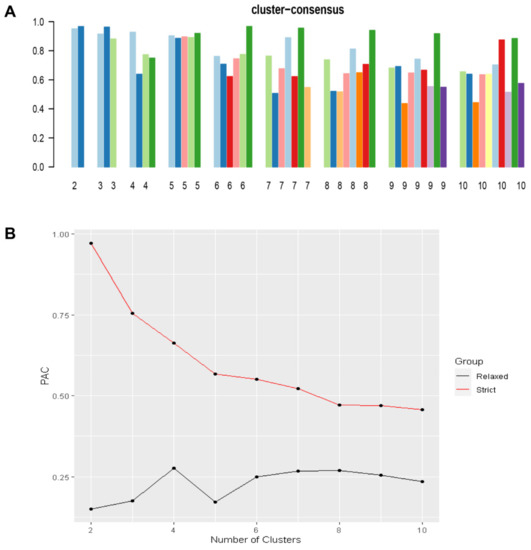 - Wilkerson, M.D.; Hayes, D.N. ConsensusClusterPlus: A class discovery tool with confidence assessments and item tracking. Bioinformatics 2010, 26, 1572–1573. [Google Scholar] [CrossRef] [Green Version]