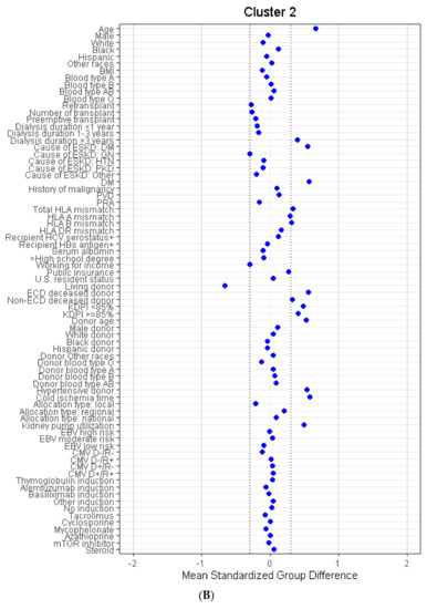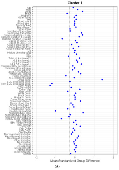 Characteristics of the five clinically distinct clusters are shown in Table 1. According to standardized mean difference, shown in Figure 3A–E, cluster 1 was characterized by recipients who were preemptive (26%) or had a shorter time on dialysis (25% < 1 year dialysis, 29% 1–3 years dialysis). Common causes of kidney disease in cluster 1 recipients included diabetes (33%) and glomerular disease (27%). Cluster 1 recipients were not sensitized (PRA 0%) and were the most likely of the five clusters to receive a living donor kidney transplant (97%).