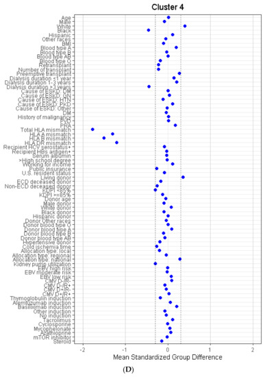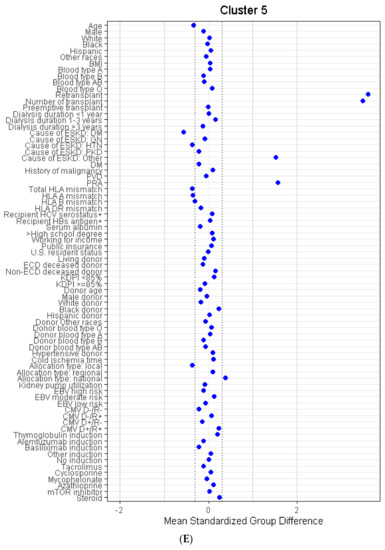 (A) The standardized differences in cluster 1 of morbidly obese kidney transplant recipients for each of the baseline parameters. (B) The standardized differences in cluster 2 of morbidly obese kidney transplant recipients for each of the baseline parameters. (C) The standardized differences in cluster 3 of morbidly obese kidney transplant recipients for each of the baseline parameters. (D) The standardized differences in cluster 4 of morbidly obese kidney transplant recipients for each of the baseline parameters. (E) The standardized differences in cluster 5 of morbidly obese kidney transplant recipients for each of the baseline parameters. The x axis shows the standardized differences values, and the y axis shows baseline parameters. The dashed vertical lines represent the standardized differences cutoffs of <−0.3 or >0.3. Abbreviations: BMI: body mass index, CMV: cytomegalovirus, D: donor, DGF: delayed graft function, DM: diabetes mellitus, EBV: Epstein-Barr virus, ECD: extended criteria donor, ESKD: end-stage kidney disease, GN: glomerulonephritis, HBs: hepatitis B surface, HCV: hepatitis C virus, HIV: human immunodeficiency virus, HLA: human leukocyte antigen, HTN: hypertension, KDPI: kidney donor profile index, mTOR: mammalian target of rapamycin, PKD: polycystic kidney disease, PRA: panel reactive antibody, PVD: peripheral vascular disease, R: recipient.
