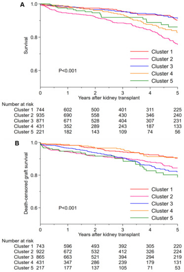 (A) Patient survival and (B) death-censored graft survival after kidney transplant among five unique clusters of morbidly obese kidney transplant recipients in the USA.